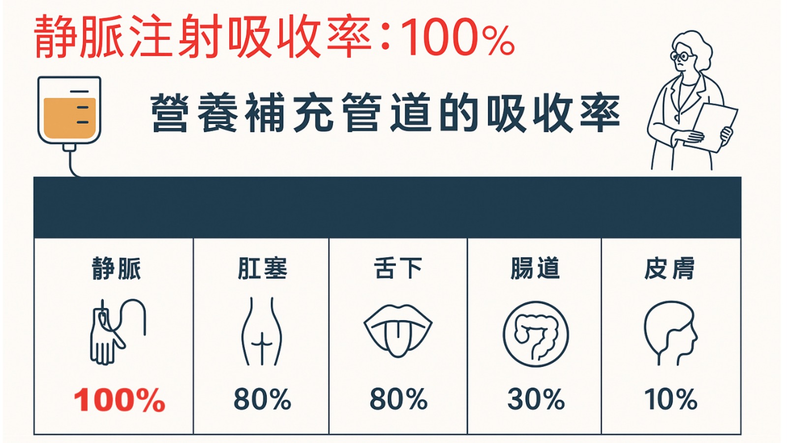 | 補充方式 | 吸收率(臨床數據) | 備註說明 |