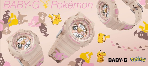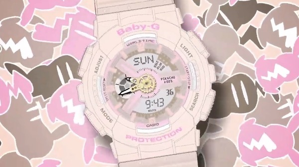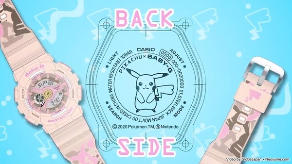 這款 BABY-G x Pokemon 手錶(BA-110PKC-4A)主色調為米色,錶面有著精靈球的圖案,而指針更是比卡超的剪影,十分可愛。除此之外,手錶背面有著比卡超的圖案,錶帶採取迷彩設計,但圖案卻是無數的比卡超跟他的腳印。就連手錶扣的部分亦印有比卡超的心形尾巴圖案,低調之餘十分可愛。