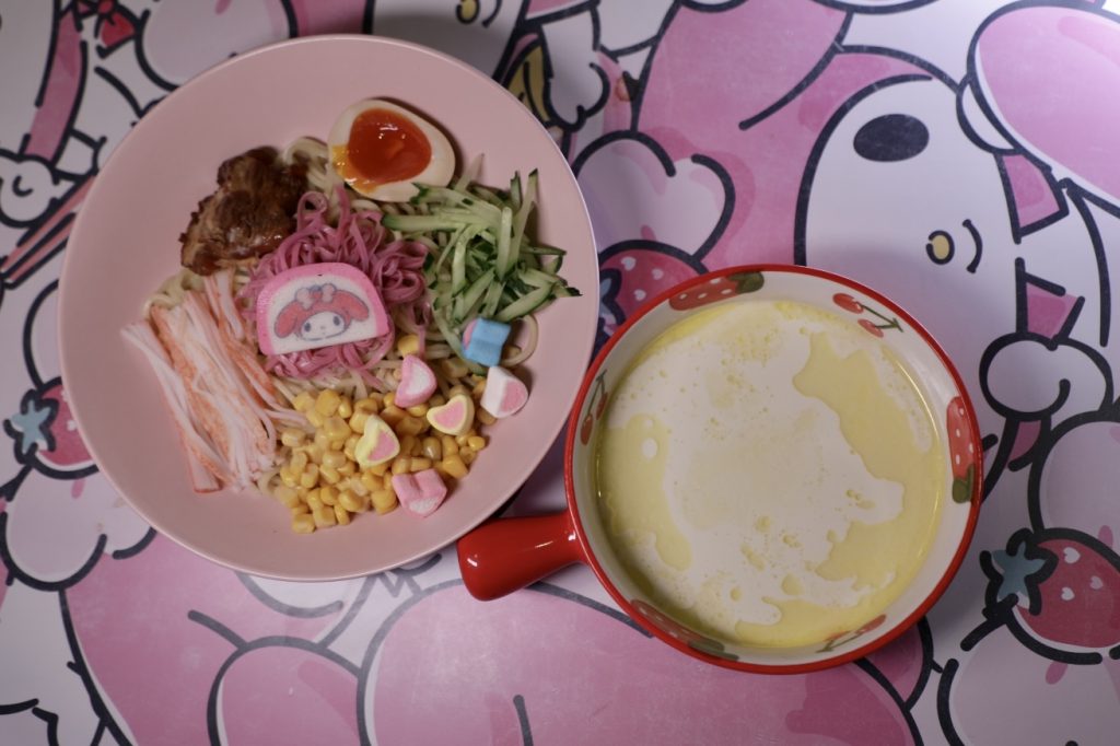 My Melody特製沾麵配熱牛奶湯,以粉紅色圓碟配上不同配料、Melody魚片以及粉色棉花糖,非常特別。