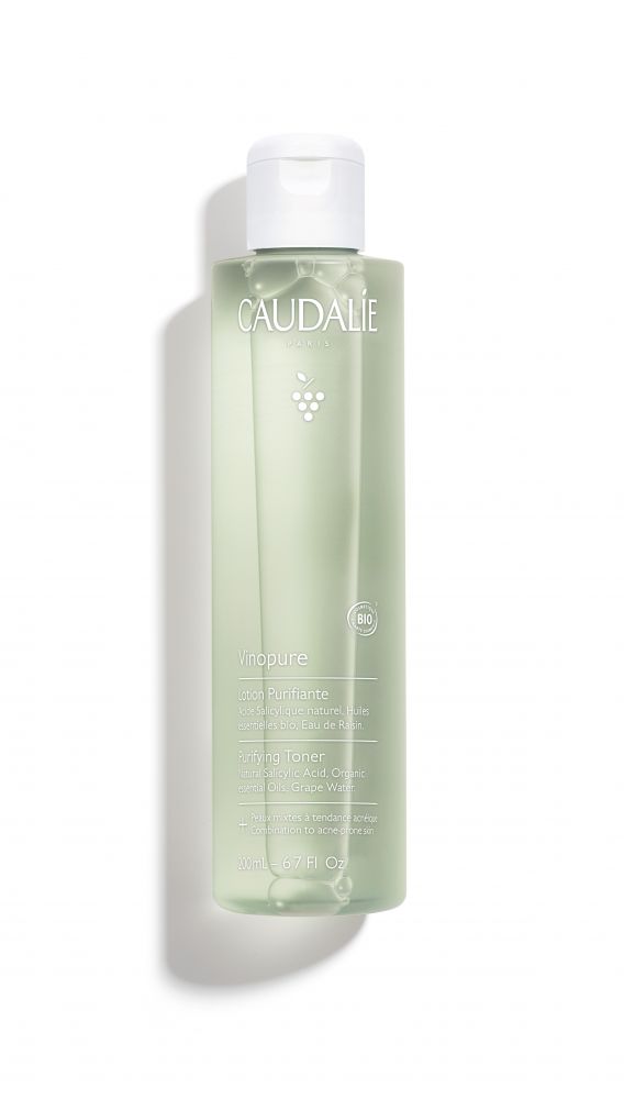 Caudalie Vinopure Purifying Toner 中由 6 種有機抗菌精油、天然植物水楊酸、有機葡萄籽水和有機玫瑰水糅合而成,即使是敏感肌亦可使用,輕輕一抹,即時溫和去除老化角質,保持毛孔暢通無阻及緊緻毛 孔,預防因死皮細胞積聚而引發粉刺暗瘡,並有抗菌、控油和亮膚 效能,同時持久補水,紓緩皮膚失調不適 情況。