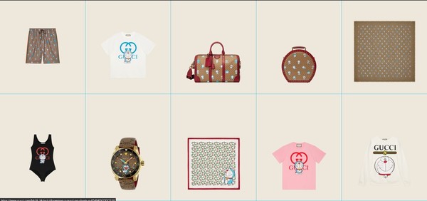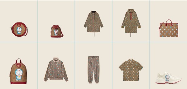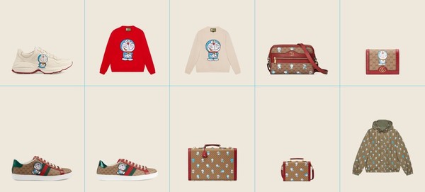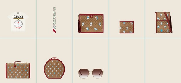 Gucci 早前聯乘了迪士尼經典卡通角色唐老鴨,最新就有多啦A夢聯,將會有38款服裝飾品任選,包括:T恤、衞衣、外套、牛仔褲、波鞋、銀包、手袋、公事包、泳衣及手錶等。