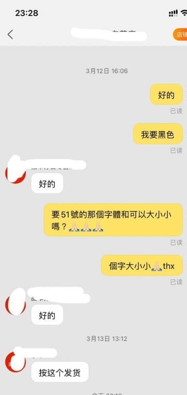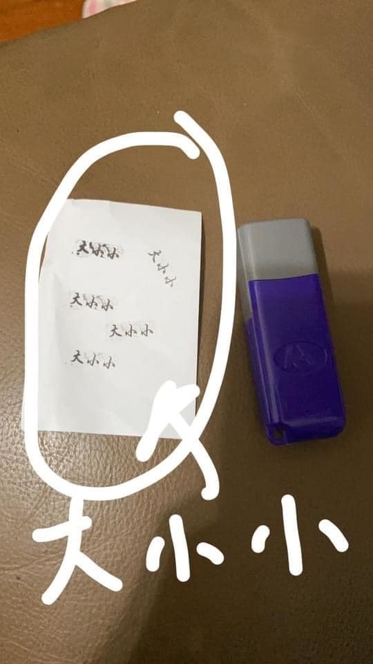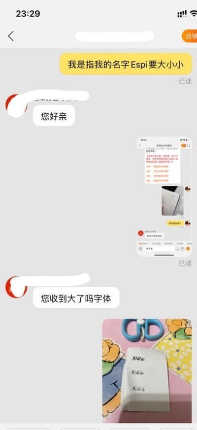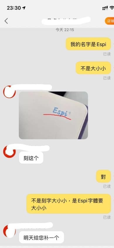 惟收到貨後,印章的確是黑色,但印出的字體卻是「大小小」,此事令事主大感無奈,便與賣家理論。事主當時便與賣家表示「我是指我的名字 Espi 要大小小」,但賣家卻回覆「您收到大了嗎字體」,明顯仍不知事主的意思。其後事主再次重申「我的名字是 Espi,不是大小小」,後來賣家才「如夢初醒」地明白原來事主要在印章上刻「Espi」而非「大小小」,之後便向其表示「明天給你補一個」。