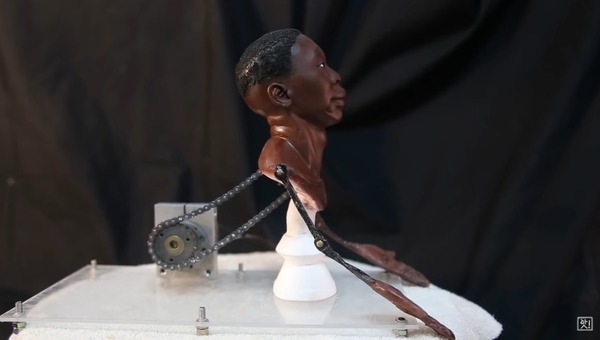 只見 ATMUMAN 從零開始雕刻出 Khaby Lame 的頭雕並進行上色,之後就找來一個帶齒輪的摩打,並把雙手手掌裝上去。結果,這個「黑人無言哥攤手裝置」可以不斷以無言的表情,將雙手大力地攤在大家面前,效果十分好笑。
