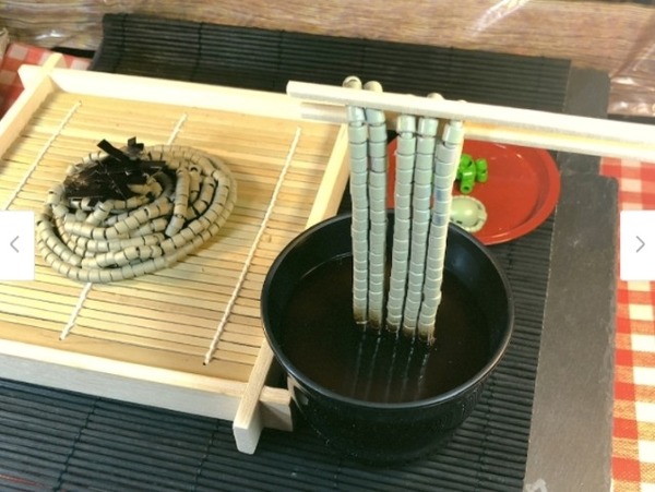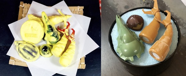 如用各種模型盾牌製作而成的壽司拼盤、以模型零件製作出的雜錦天婦羅等