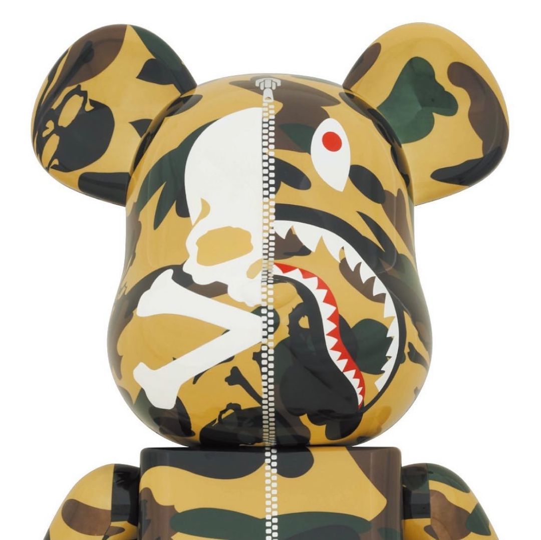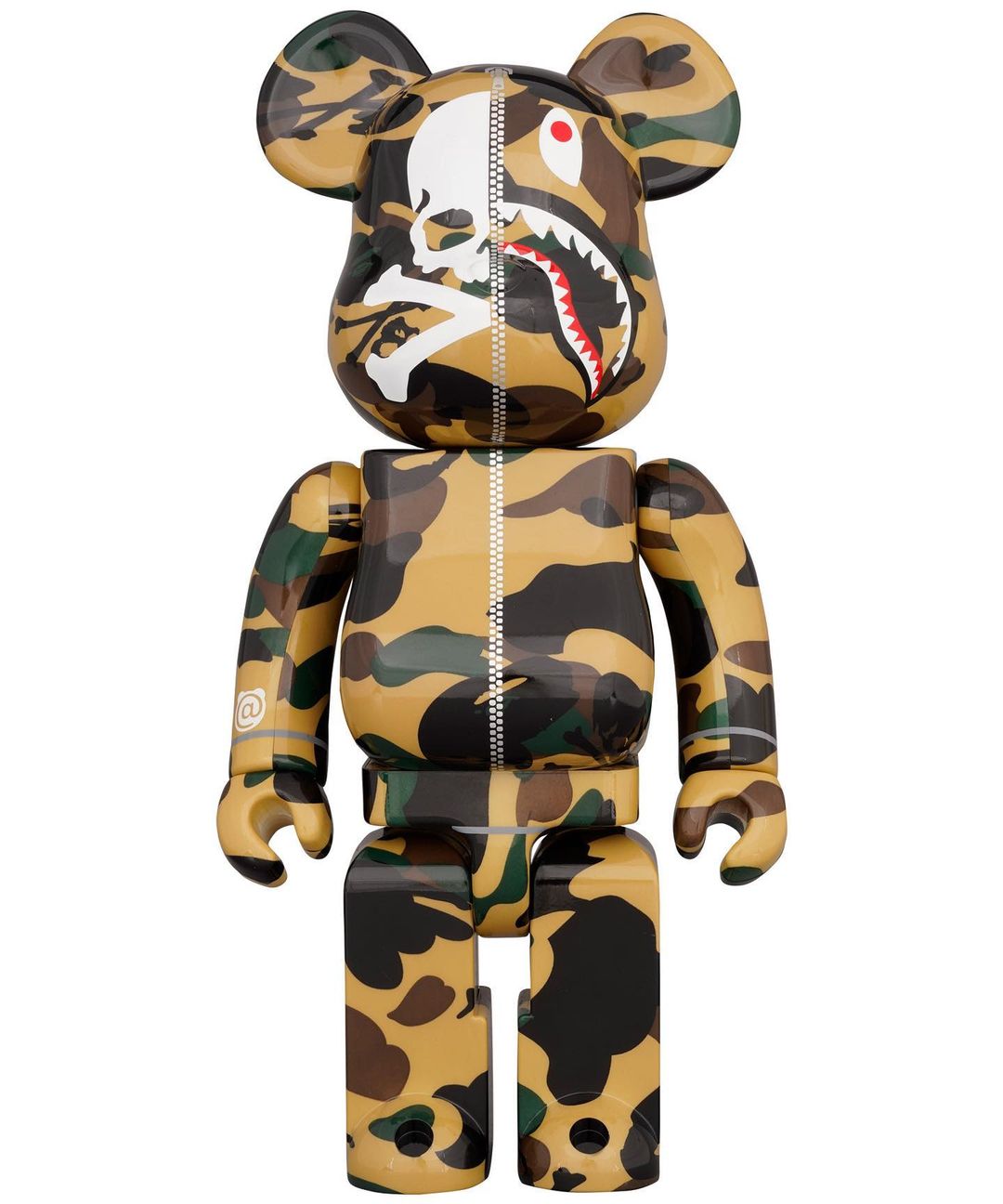 而這次雙方再度攜手,採納服裝系列以外的潮玩系列為藍本,打造  BE@RBRICK  聯名版本公仔。 這回推出 1000% 尺寸,以 A BATHING APE 標誌性「迷彩」為背景,再於頭部與胸口部分注入半骷髏半鯊魚和 Logo 點名身份,相當簡單又粗暴地呼應本次設計主軸,擺起來肯定也相當壯觀。