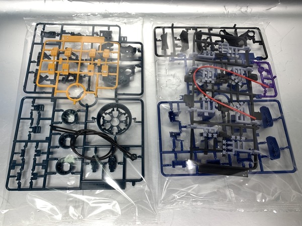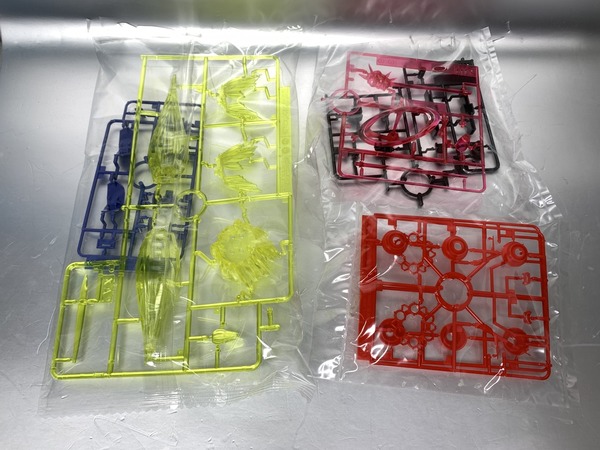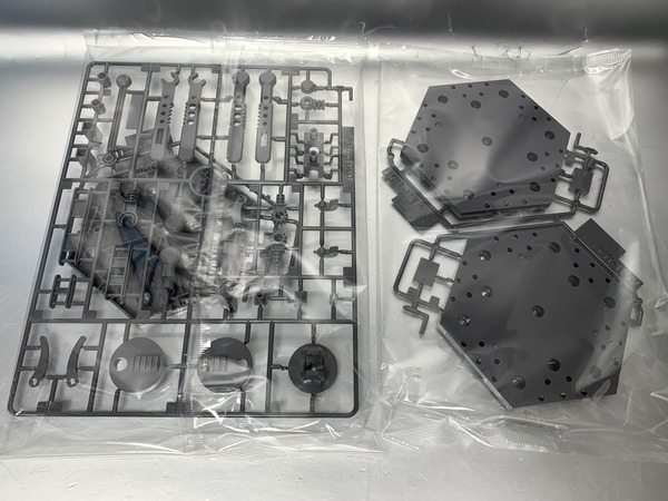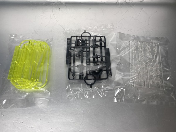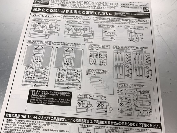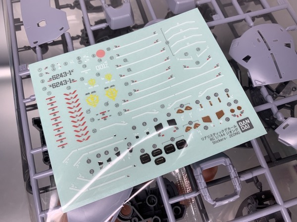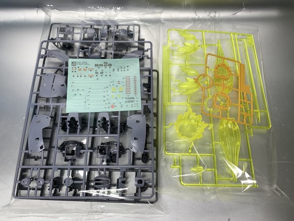 RG自護號的板件已達18塊,分色有淺灰、灰、綠、紅、淺藍、橙、黃等,亦已經有提供基本地台,可支撐本體及放出雙手有線式MEGA粒子砲。特效套組就額外加入了十隻手指的發射特效、本體底部推進器的噴咀特效、高達用的特效零件,另有模仿基地牆壁的背景板及固定部件。其實這些額外配件,手指砲是流用1/144 HG的鐳射劍配件、輔助噴咀使用Figure-rise特效包、背景板為30Mins Mission Customize Scene Base等,僅有底部主推進器的噴咀特效是RG自護號專用模件。而今次的金屬膠貼分量感覺也比高達類要簡單一點。