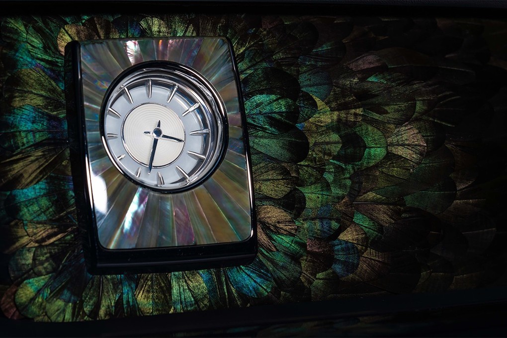 每一輛 Rolls-Royce 都是獨一無二的作品,這次由Abu Dhabi Motors委託Rolls-Royce特製的Phantom Iridescent Opulence「虹彩富饒」,全車最大亮點在於其內裝,除了標誌性的星空車頂篷之外,Gallery 部分由瑞士專業材料公司 Nature Squared 操刀設計,將 3,000 根天然鳥類尾羽透過手工縫製於開孔織物上並圍繞著 Mother of Pearl 時鐘,將其鮮明光澤與虹彩效果完美呈現出形同藝術品一般的樣貌。
