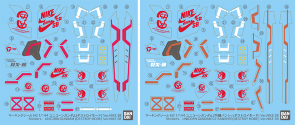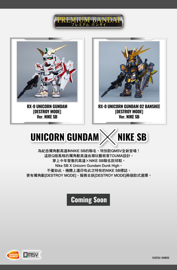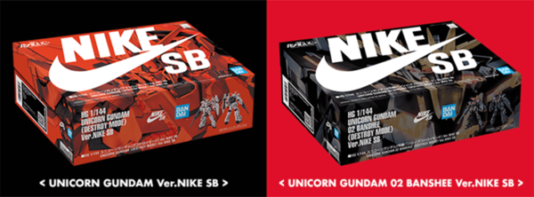 而BANDAI方面亦會為此推出特別版高達模型,分別是 HG UNICORN GUNDAM DESTORY MODE ver NIKE SB及HG UNICORN GUNDAM 02 BANSHEE DESTORY MODE ver NIKE SB,會有特別設計的盒繪及全新標記貼紙,日本會以網上限定抽籤的方式發售,香港P-BANDAI為先到先得發售【按此】。另有特別款QMSV人偶,除了機身的標記為特別版,腳部也是改用了「Project Unicorn White」鞋款的造型。