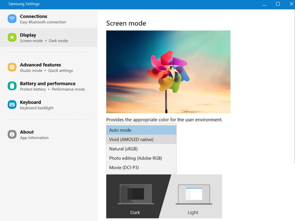 Samsung Settings 內提供多個顯示優化模式。