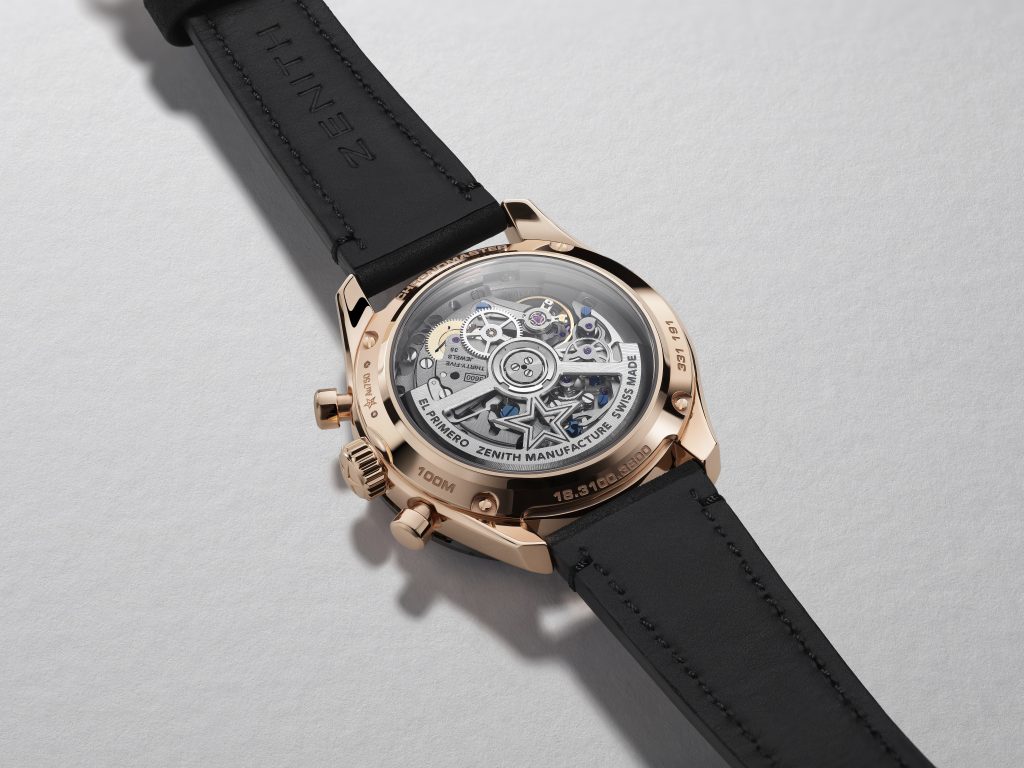 腕錶搭載El Primero 3600型高振頻自動機芯,這為錶廠招牌作El Primero機芯的最新版本,振頻為每小時36,000次,能夠精準顯示1/10秒計時,同時動力儲存增加至60小時。機芯採用更為通透的全新結構,整體造型和潤飾充滿現代氣息,搭配藍色導柱輪和飾以品牌五角星圖案的鏤空上鏈擺陀,令腕錶設計更臻完美。