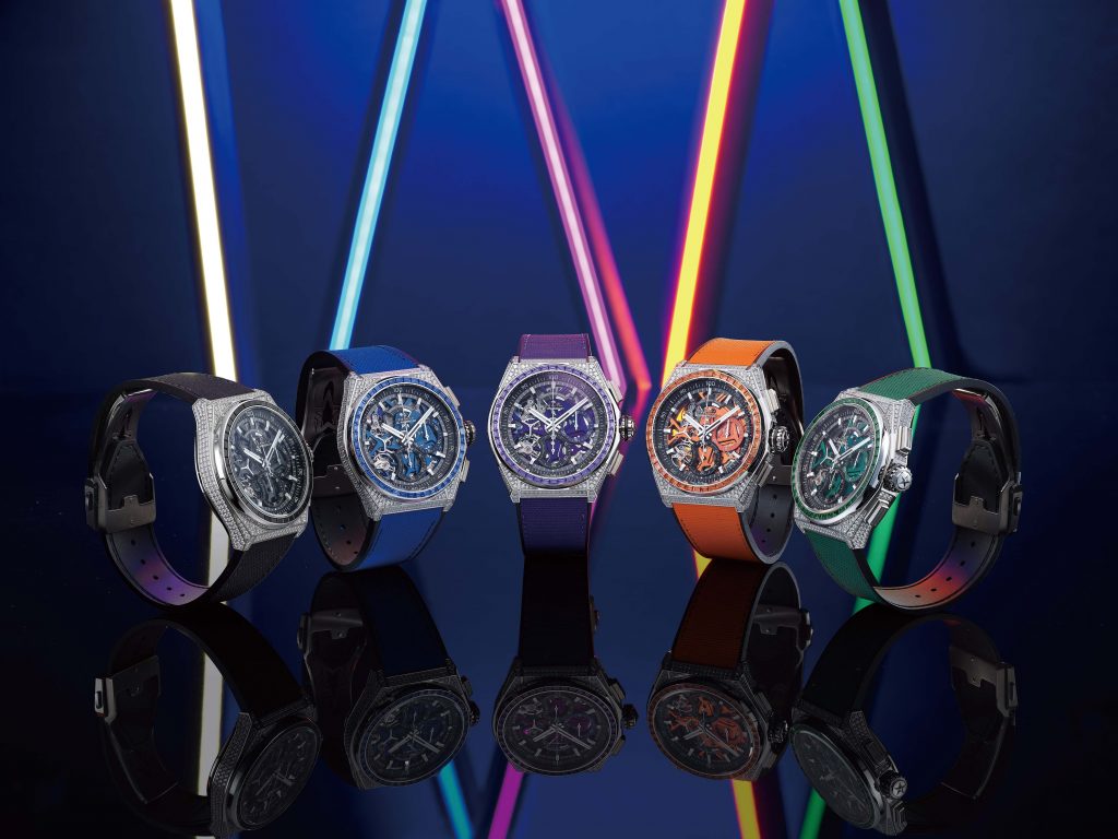 新作就運用嶄新的上色工藝製作出彩色計時機芯,並飾以散發天然光澤的彩色寶石。由五款璀璨矚目腕錶組成,雖然,這個「戰隊」無經典的「紅戰士」,但綠、橙、藍、紫、黑,一眾近年大熱之色也被它囊括。重點是,錶款用色由寶石顏色至機芯,到橡膠錶帶色彩,也相互呼應。綠色錶款鑲嵌綠色沙弗萊石、橙色錶款鑲嵌橙色藍寶石、藍色錶款鑲嵌藍色藍寶石、紫色錶款鑲嵌紫晶石榴石、黑色錶款鑲嵌黑色尖晶石。
